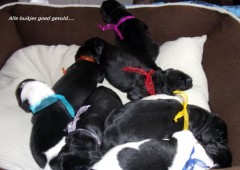 Madelief is bevallen van 7 prachtige zware pups. Het zijn 4 zwarte teefjes-1 zwarte reu-1 wit/zw. teefje en 1 wit/zw. reu . Alle puppy's zijn gereserveerd. De trotse papa is Dream Dancer.